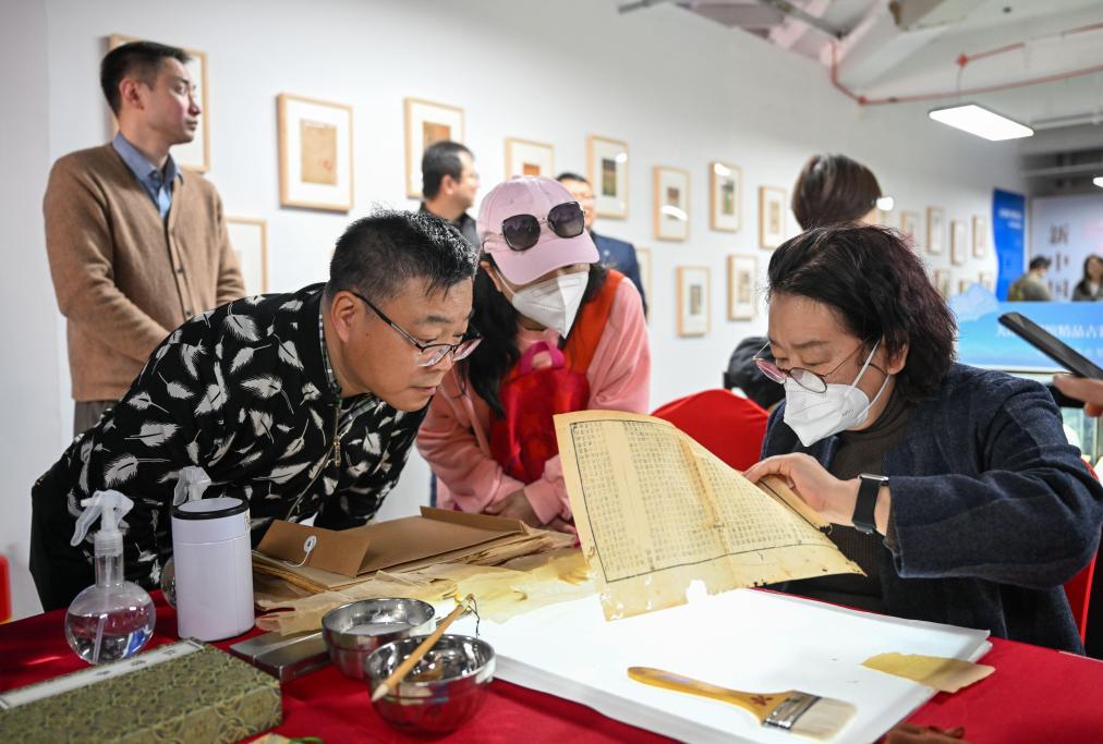3月31日,在天津棉3創意街區,市民在海河舊書市集活動上了解古籍修復。