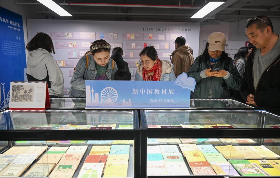 3月31日,在天津棉3創意街區,市民在海河舊書市集活動上參觀展覽。