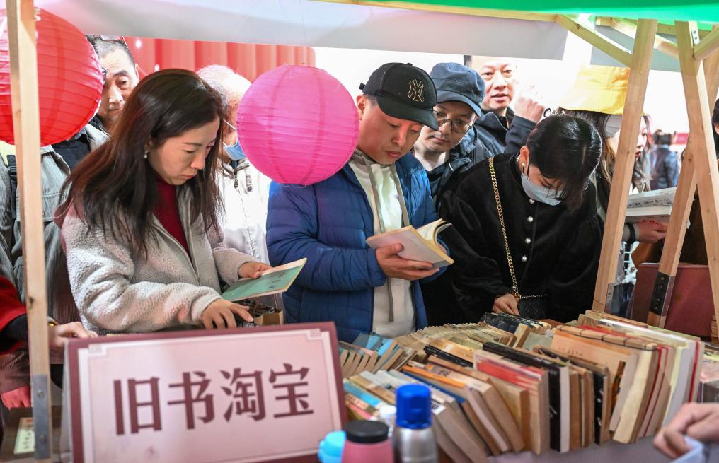 3月31日,在天津棉3創意街區,市民在海河舊書市集活動上挑選書籍。