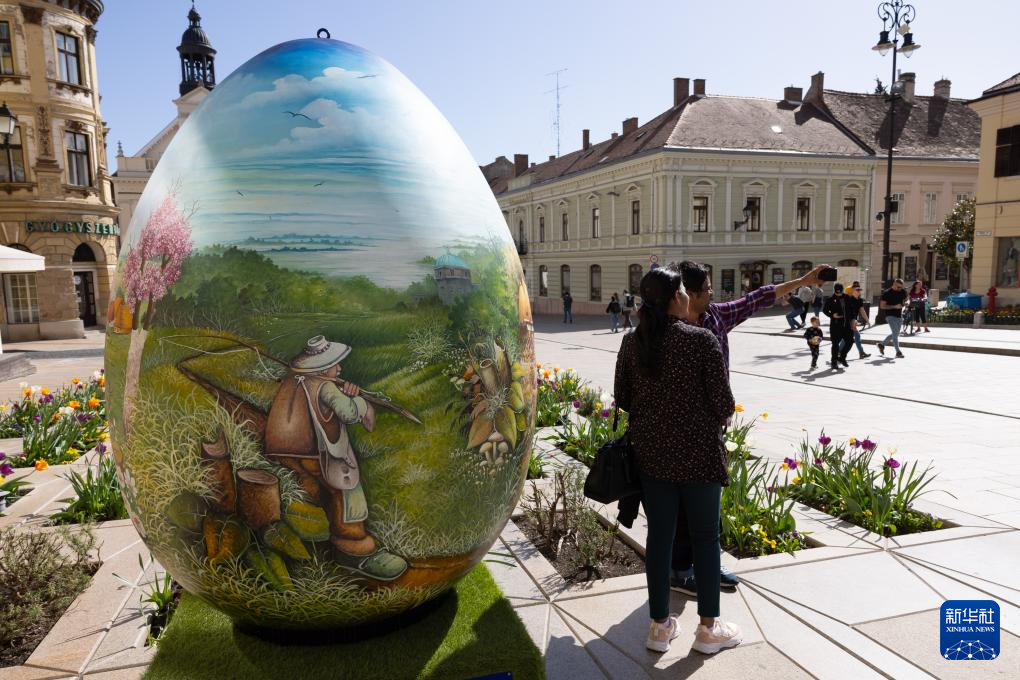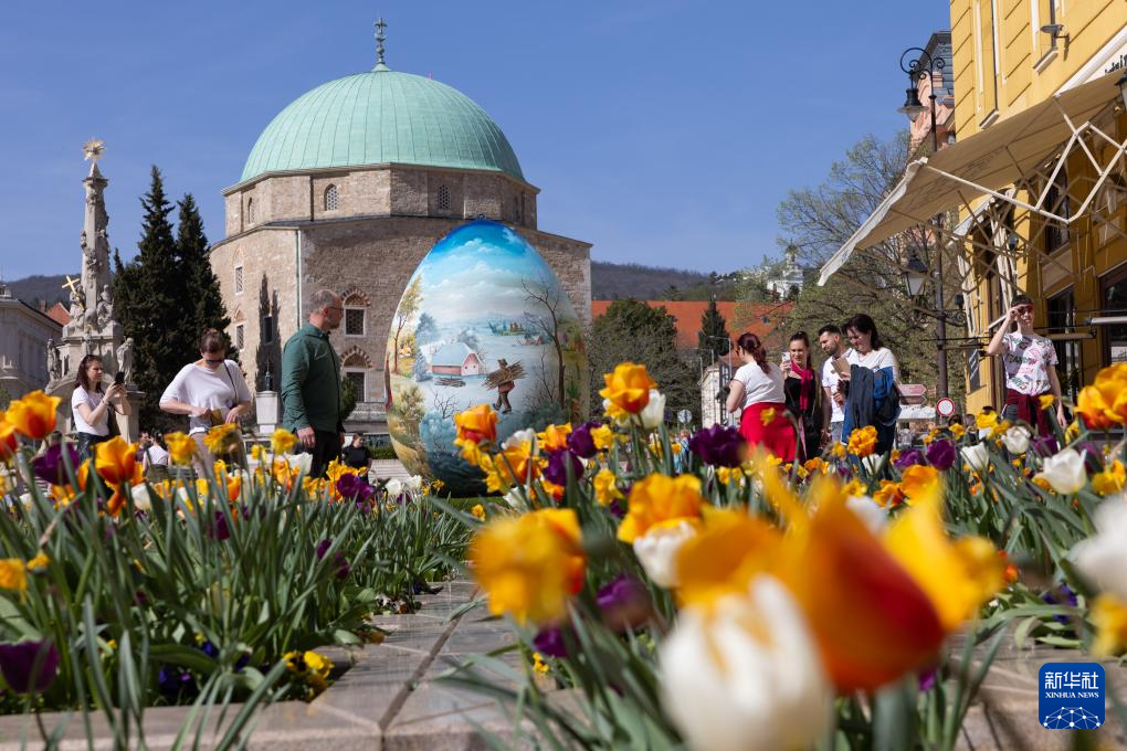 3月30日,人們在匈牙利南部城市佩奇街頭參觀復活節巨型彩蛋。新華社發(弗爾季·奧蒂洛攝)