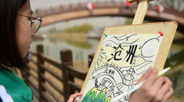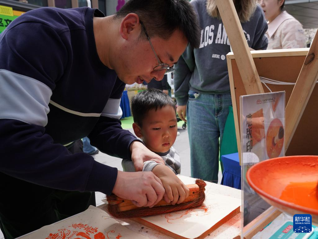 3月30日,在徐涇鎮萬科天空之城的青浦區“城市美育日”主會場,小朋友和爸爸在“美育市集”上一起體驗雕版印刷。