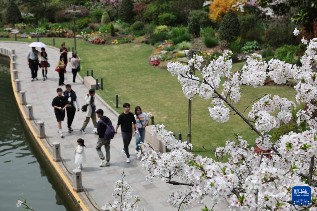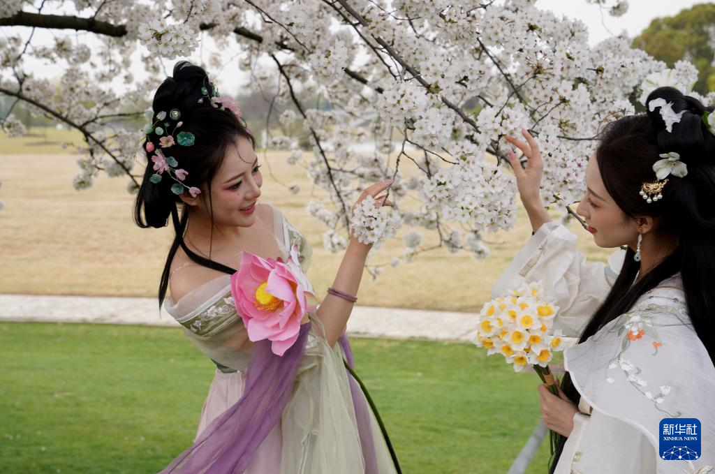 3月30日,在辰山植物園的“城市美育日”活動現場,兩名裝扮成“花神”的女子在游覽“辰山花會”。