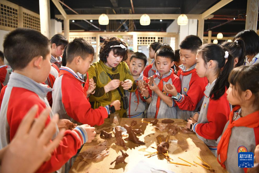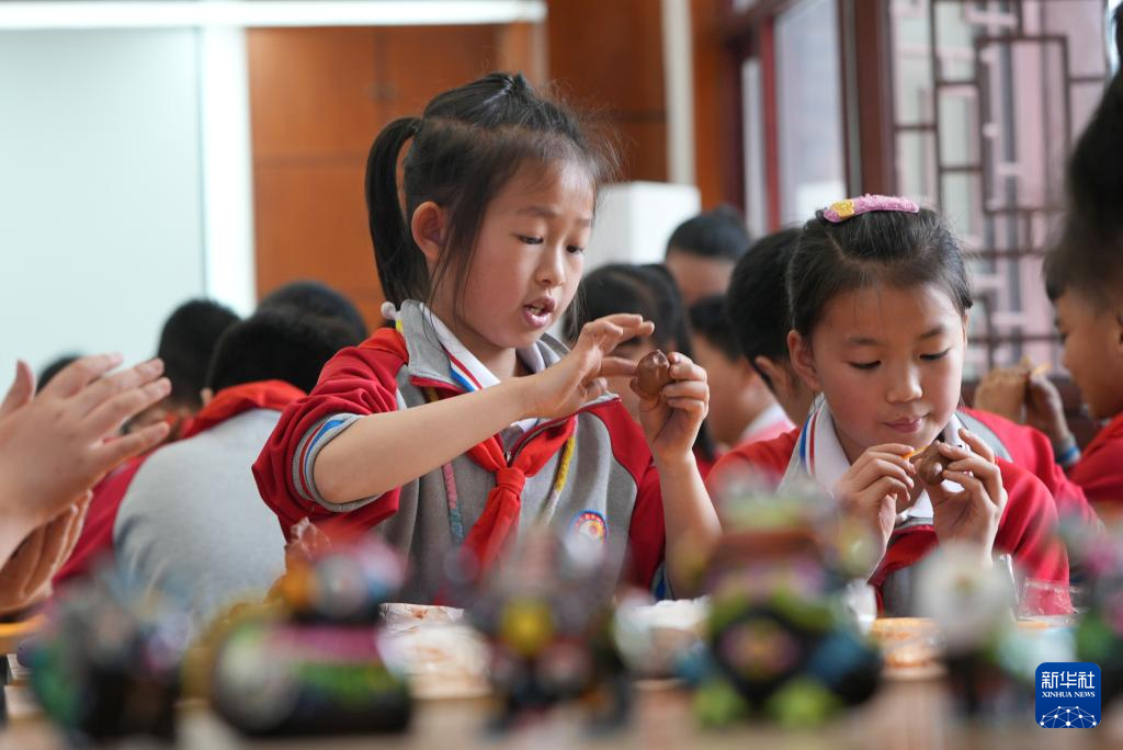 4月1日,學生在貴州省黃平縣舊州古鎮一家非遺工坊體驗泥哨制作。