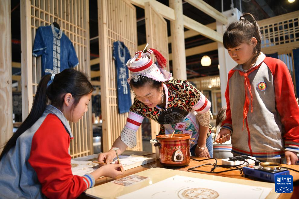 4月1日,在貴州省黃平縣舊州古鎮一家非遺工坊,民間藝人指導學生進行蠟染制作。