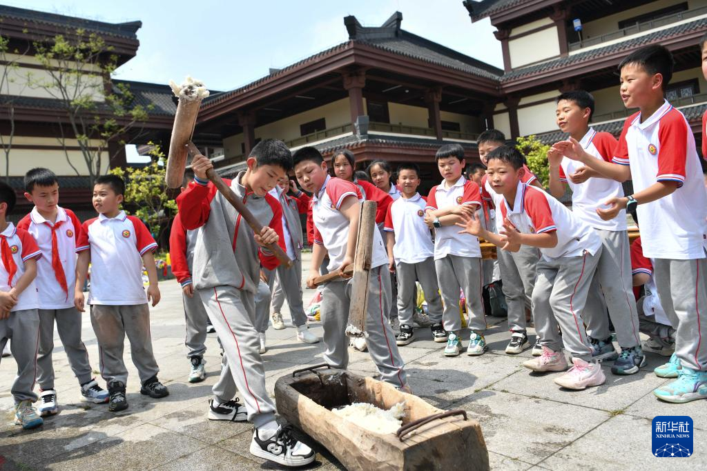 4月1日,學生在貴州省黃平縣舊州古鎮體驗打糍粑。