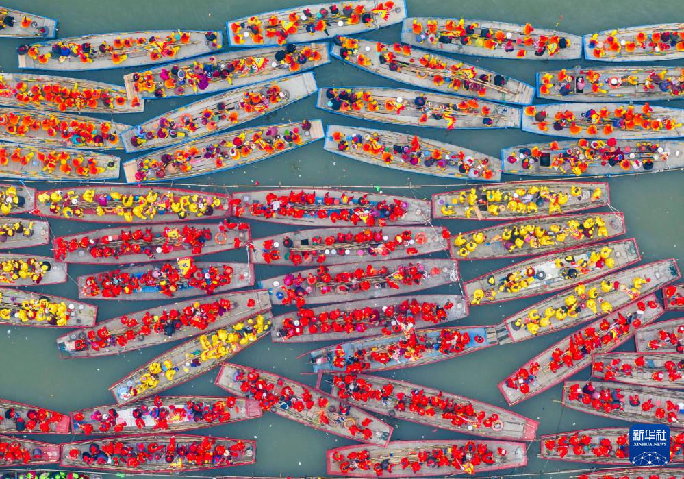 4月6日,參加完溱潼會船表演后的船只聚集在湖面上(無人機照片)。