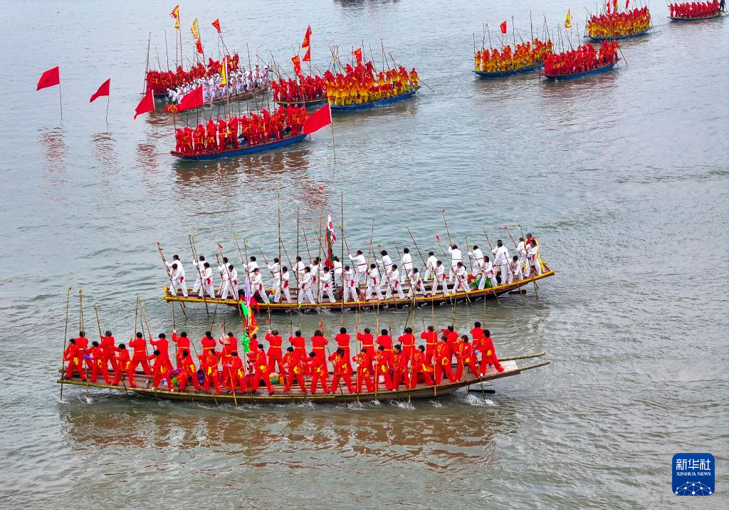4月6日,會船選手們在溱湖撐篙奮力前行(無人機照片)。