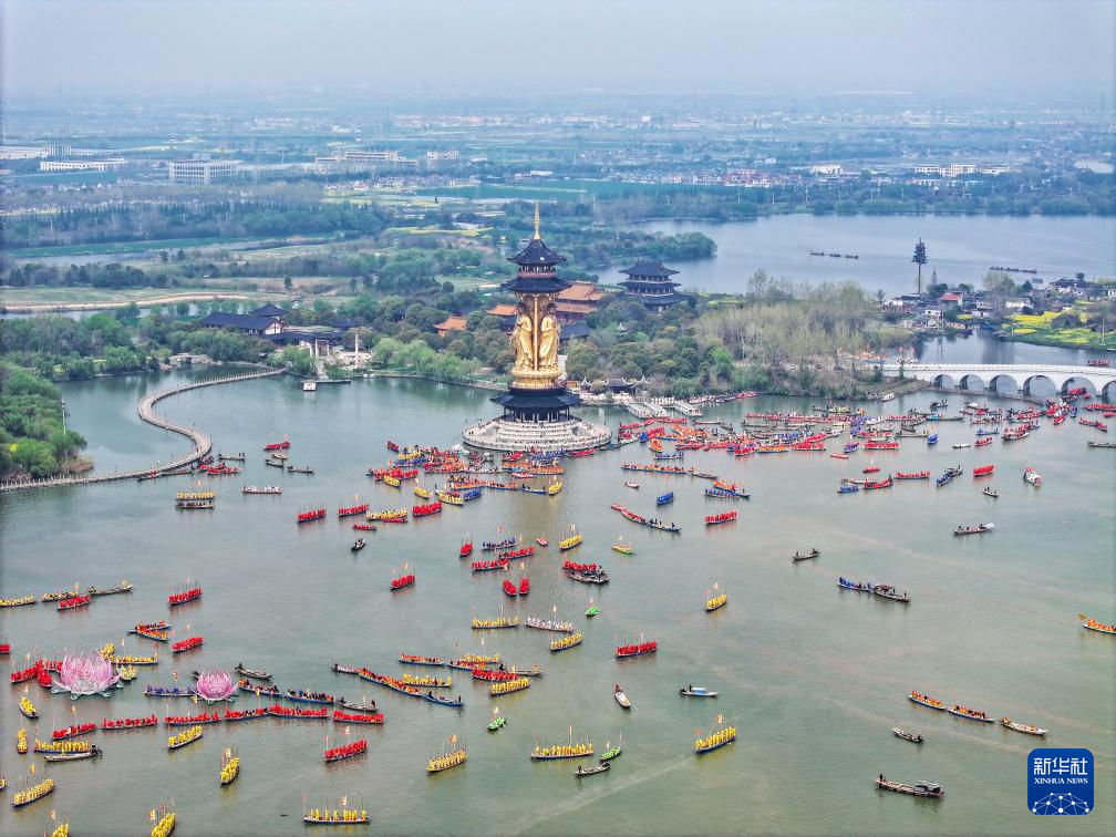 4月6日,參加溱潼會船表演的船只在湖面上整裝待發。