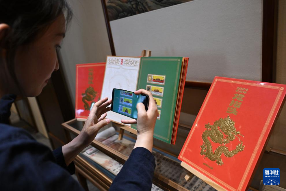 4月7日,記者在發布會上拍攝《龍抬頭》郵冊。