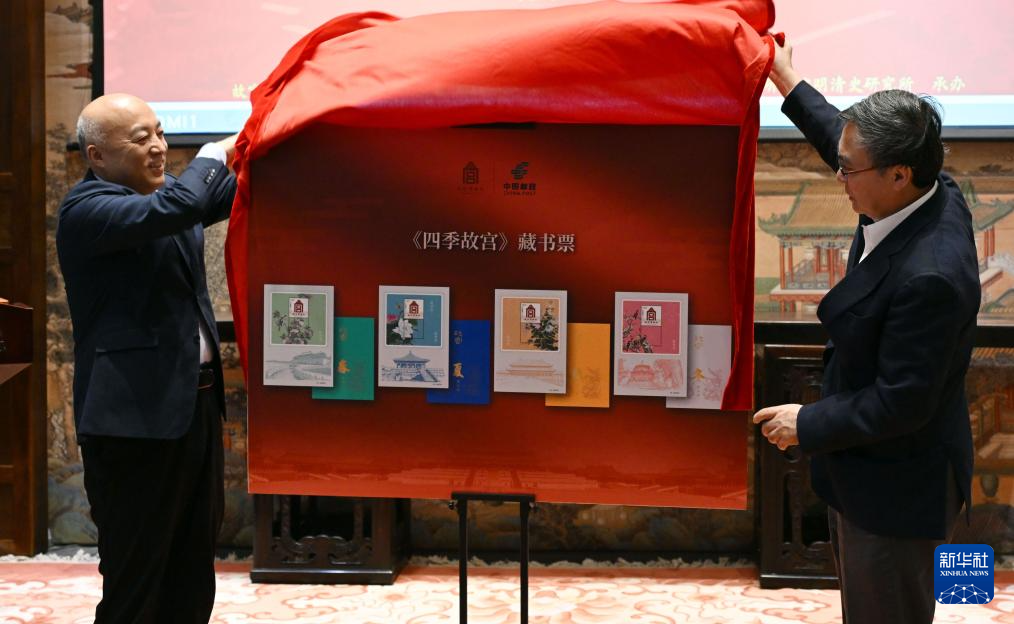 4月7日,故宮博物院院長王旭東(左)、中國郵政集團有限公司黨組書記、董事長劉愛力共同為《四季故宮》藏書票揭幕。