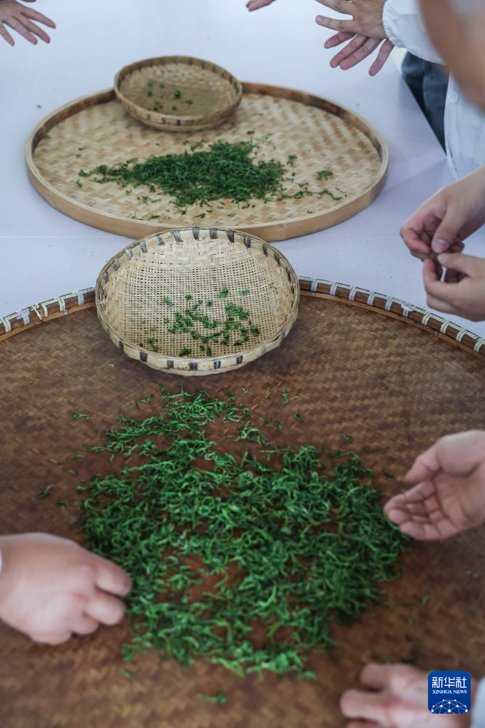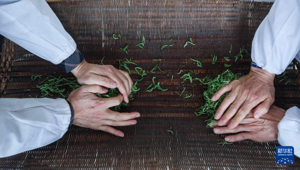4月7日,在位于浙江金華的浙江采云間茶業有限公司內,制茶師們進行舉巖茶的做形工藝。