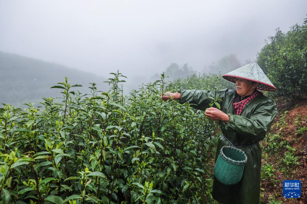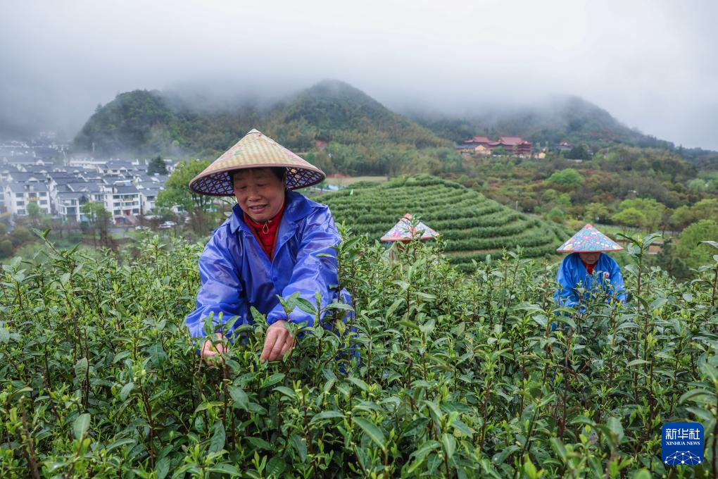 4月7日,在浙江金華的金華山鹿田村的婺州舉巖茶基地,茶農采摘舉巖茶鮮葉。