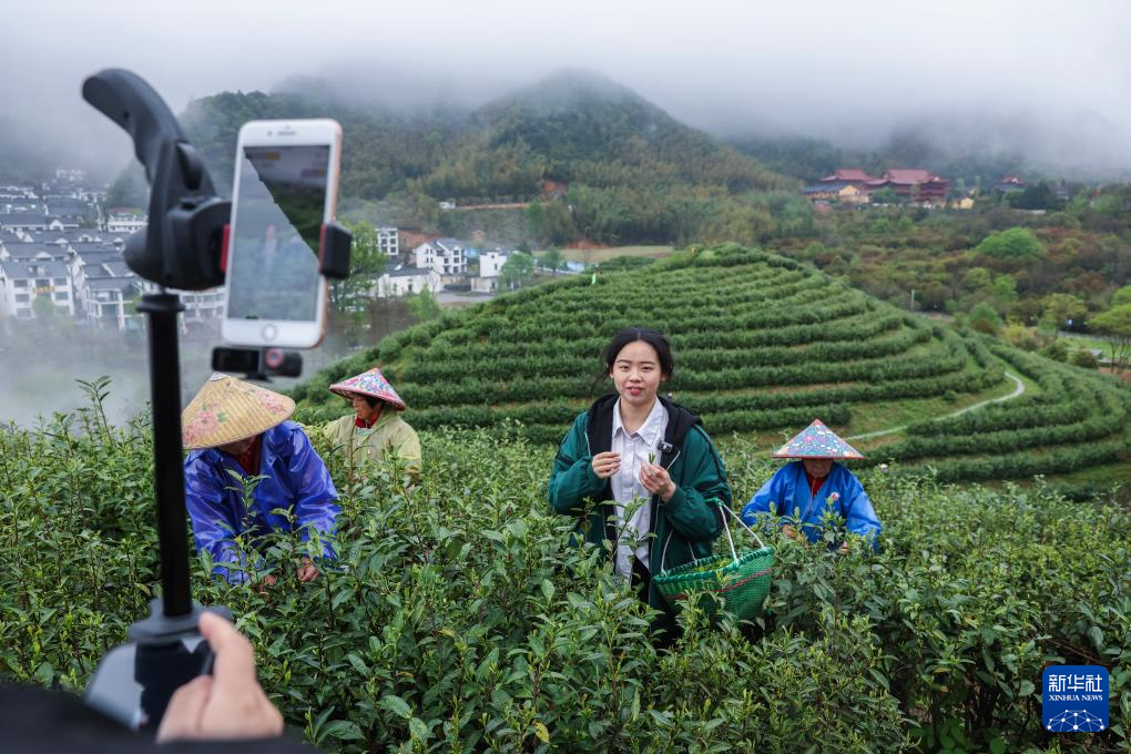 4月7日,在浙江金華的金華山鹿田村的婺州舉巖茶基地,工作人員直播介紹婺州舉巖茶。