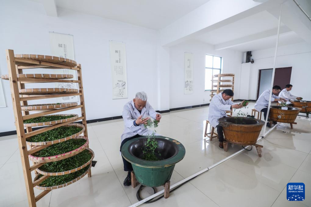 4月7日,在位于浙江金華的浙江采云間茶業有限公司內,婺州舉巖傳統制茶技藝非遺傳承人潘金土(左一)帶領制茶師進行舉巖茶的殺青工藝。