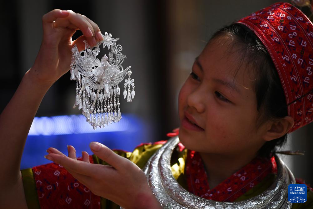 4月8日,小朋友在貴州省黃平縣谷隴鎮銀飾街欣賞一件銀飾品。
