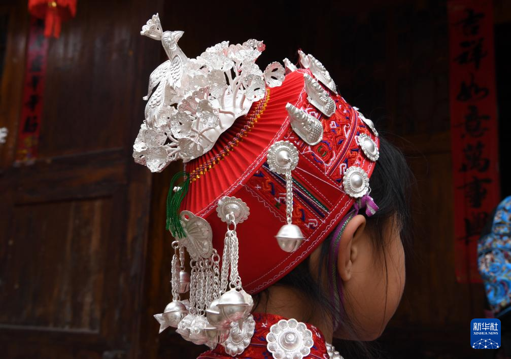 4月8日,穿著苗族盛裝的小朋友在貴州省黃平縣谷隴鎮大寨村玩耍。
