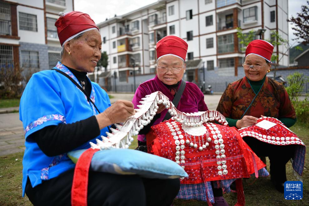 4月8日,苗族婦女在貴州省黃平縣谷隴鎮大寨村手工繡銀片(無人機照片)。