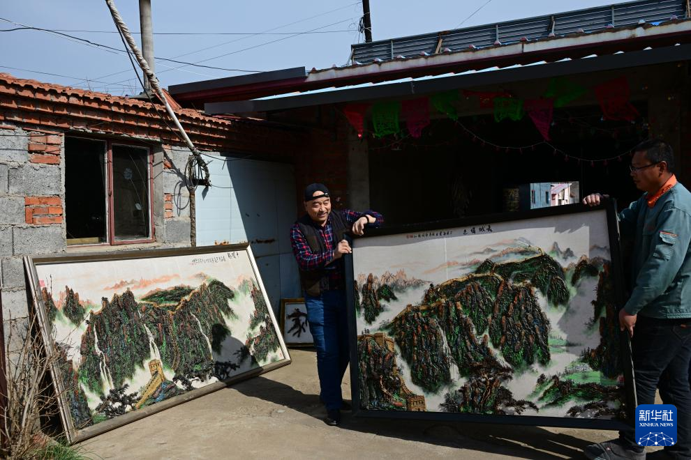4月10日,陳氏樹皮畫傳承人陳瑞明(左)在河北省隆化縣家中搬運樹皮畫。