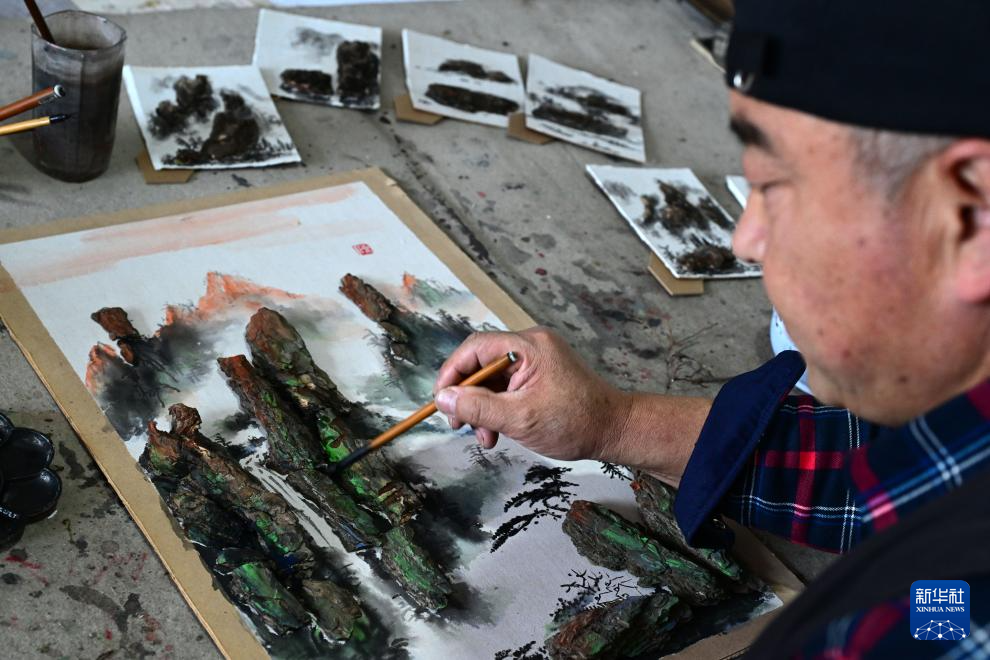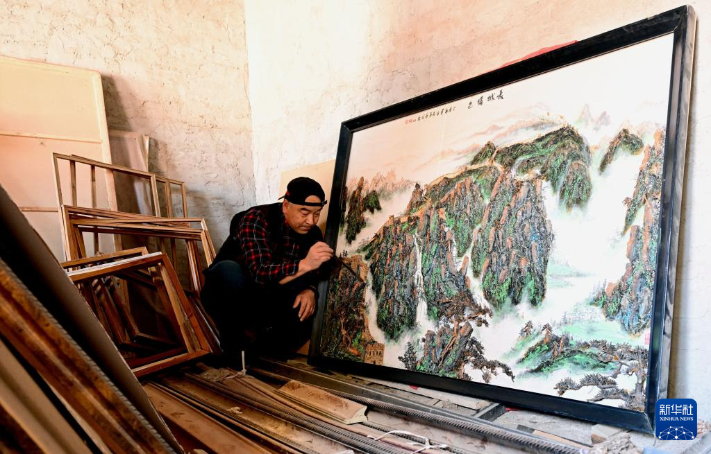 4月10日,陳氏樹皮畫傳承人陳瑞明在河北省隆化縣家中對樹皮畫進行修飾。