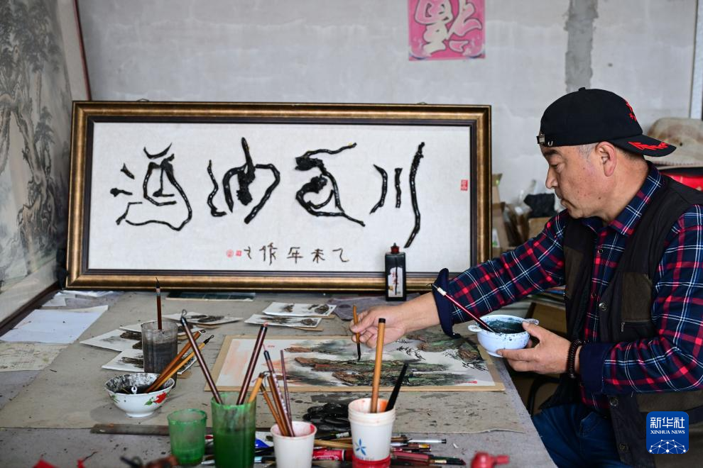 4月10日,陳氏樹皮畫傳承人陳瑞明在河北省隆化縣家中制作樹皮畫。