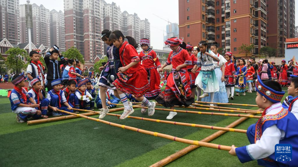 4月10日,欽州市第三十八小學的師生跳起竹竿舞,喜迎“三月三”。