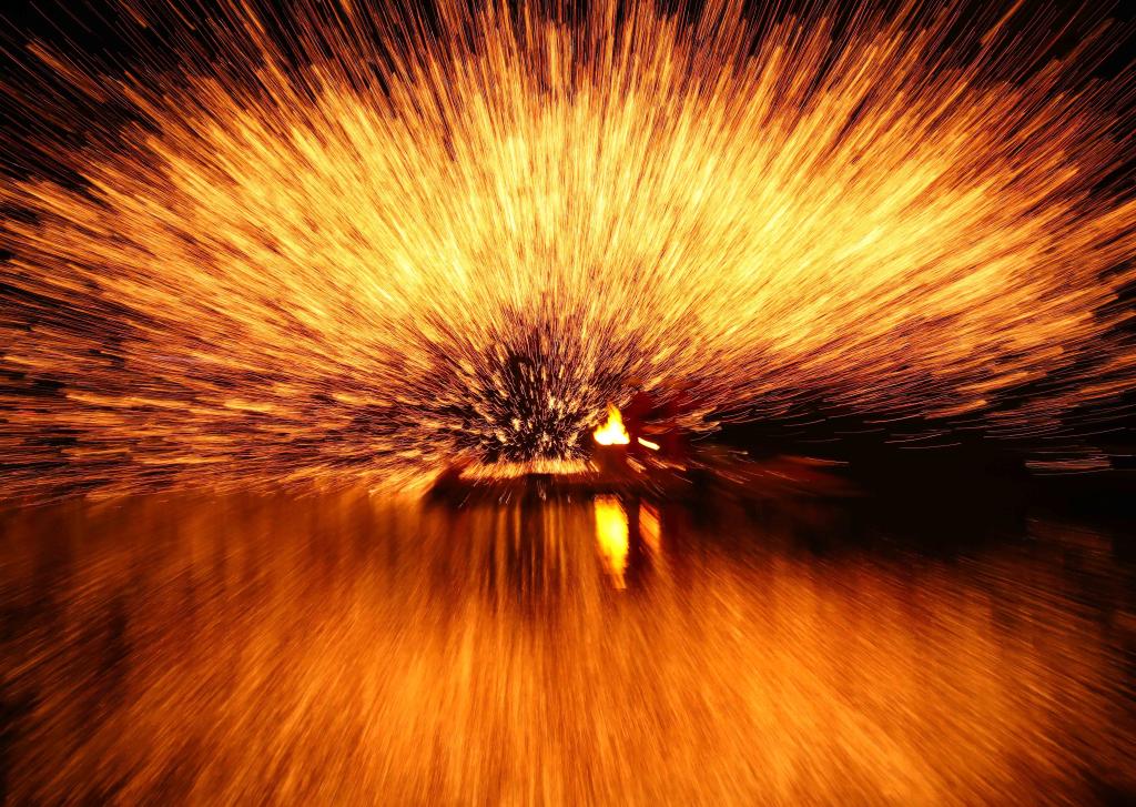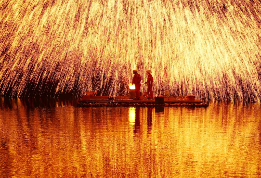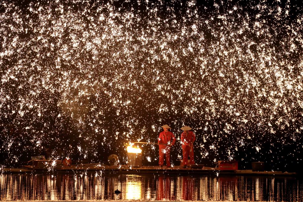 2024年4月8日,廣西壯族自治區柳州市融安縣雅瑤鄉,民間藝人在表演打鐵花。CICPHOTO/韋榮軍 攝