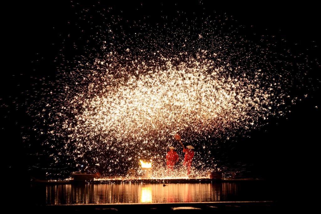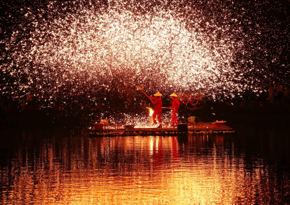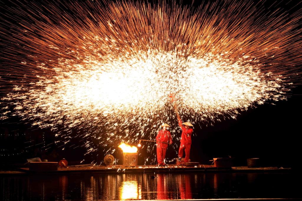 2024年4月8日,廣西壯族自治區柳州市融安縣雅瑤鄉,民間藝人在表演打鐵花。CICPHOTO/譚克興 攝