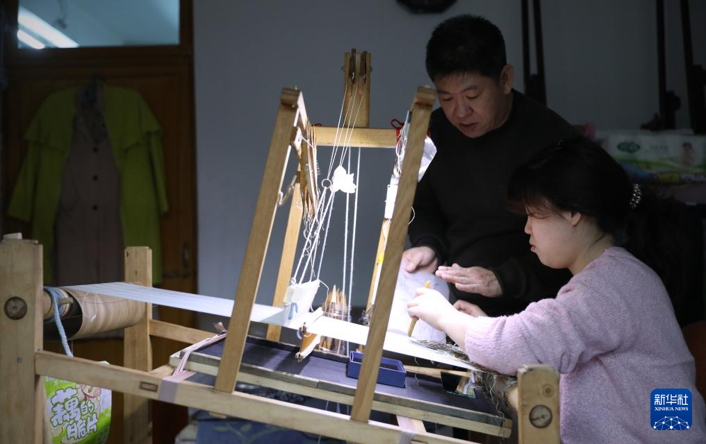 4月9日,申濤在位于營口市的家中指導女兒申圣丹進行緙絲創作。