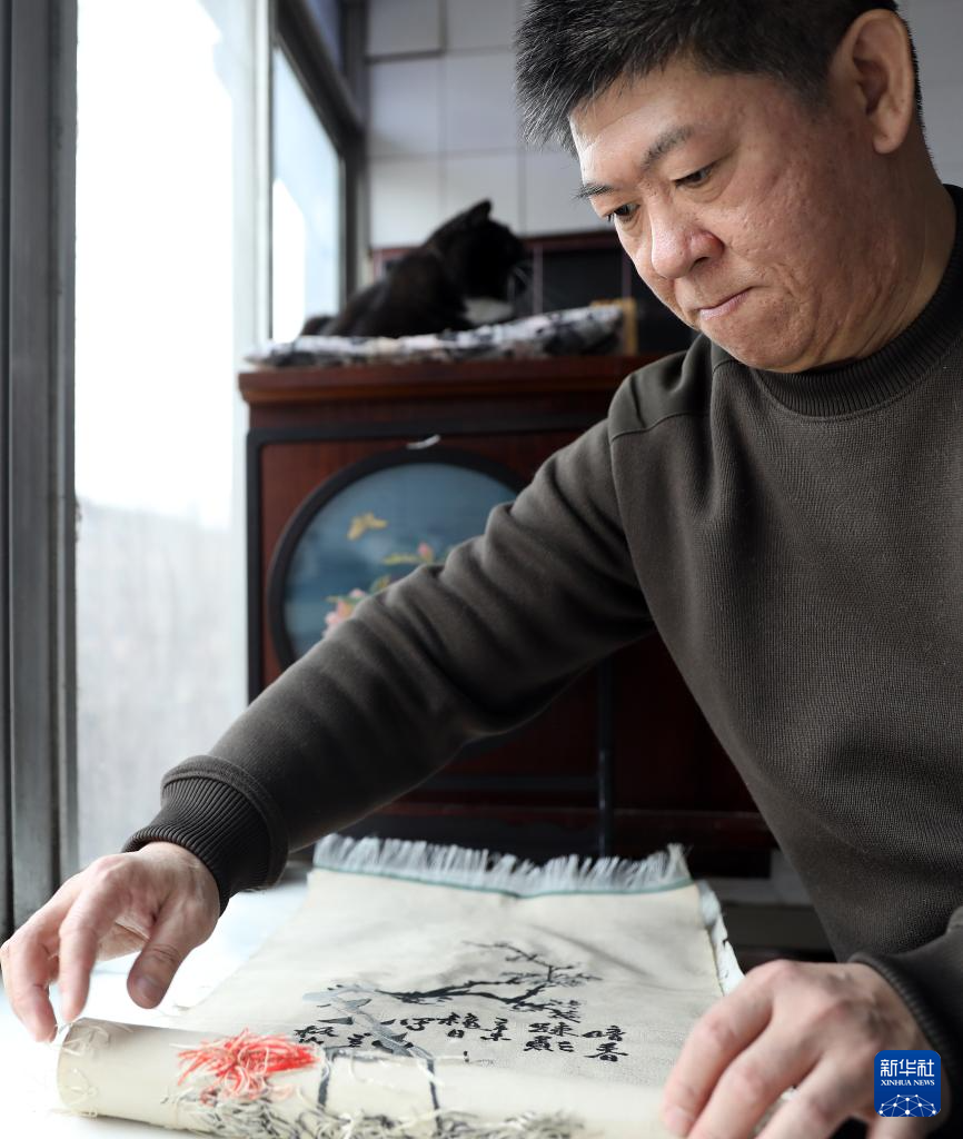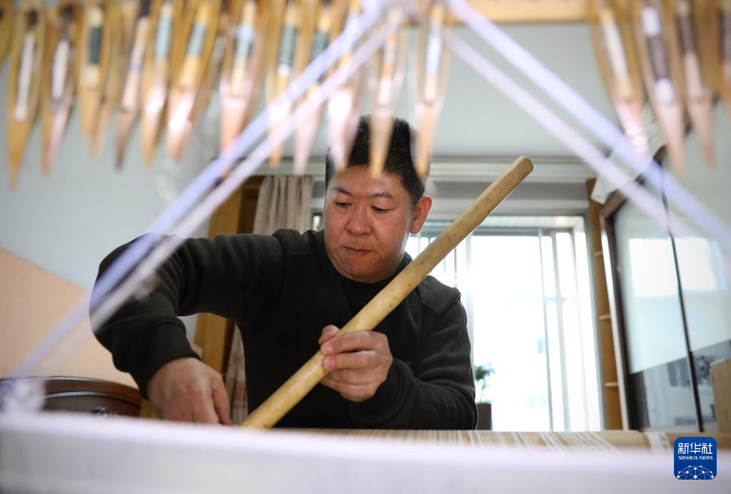 4月9日,在位于營口市的家中,申濤左手拿著纏著絲線的梭子,右手拿著梳理絲線的撥子進行緙絲作品創作。