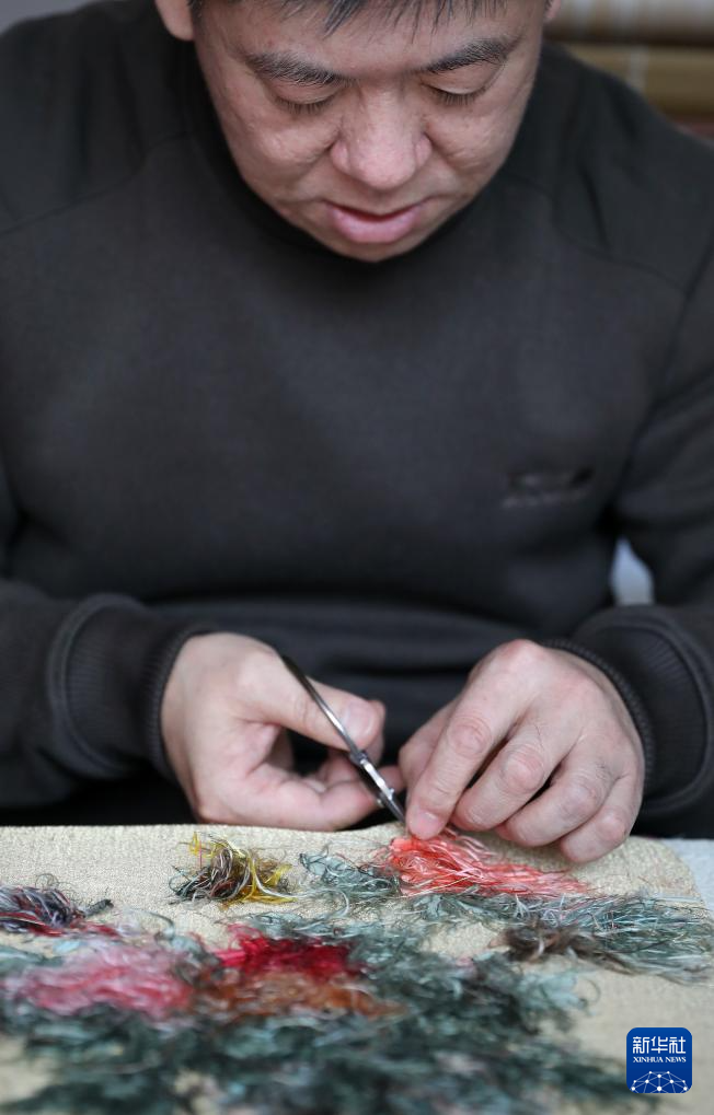4月9日,申濤在位于營口市的家中進行緙絲作品的最后一道工序——修毛頭。