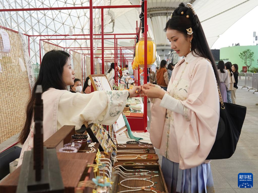 4月11日,華服愛好者在國風市集上挑選飾品。