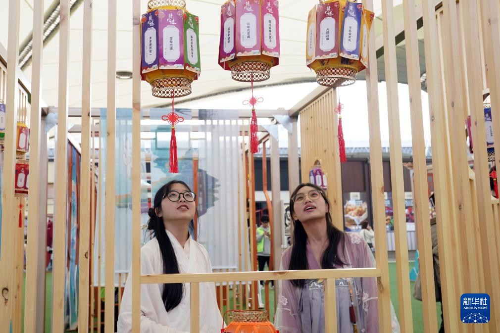 4月11日,華服愛好者在國風市集的互動體驗區參與猜燈謎游戲。