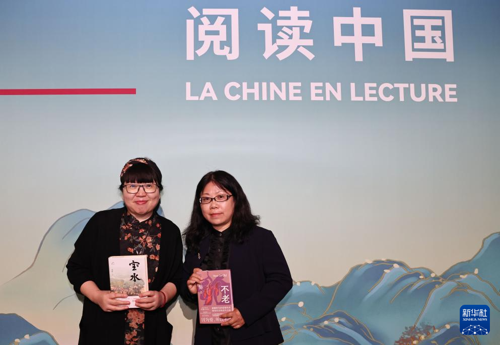 4月14日,在法國巴黎舉行的2024巴黎書展上,中國作家喬葉(左)、葉彌分別攜其作品《寶水》《不老》亮相書展。