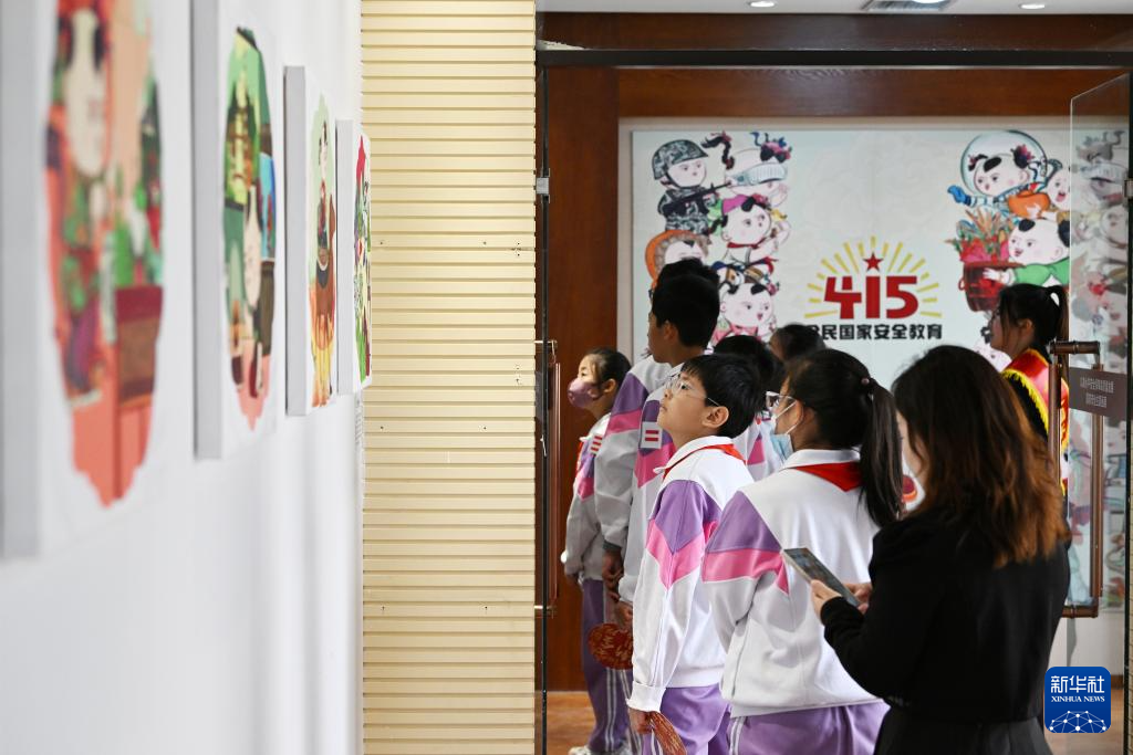 4月15日,小學生在參觀國家安全年畫娃娃藝術展。