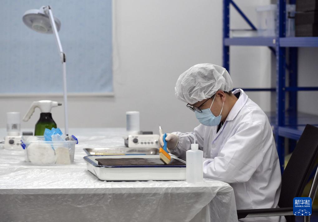 4月16日,考古工作者在武王墩考古實驗室無機質保護室內進行青銅器保護工作。