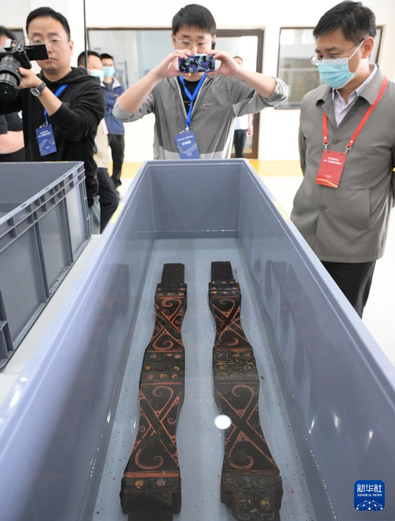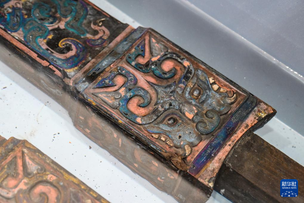 這是4月16日在武王墩墓考古實驗室內拍攝的出土浮雕彩繪漆木構件。