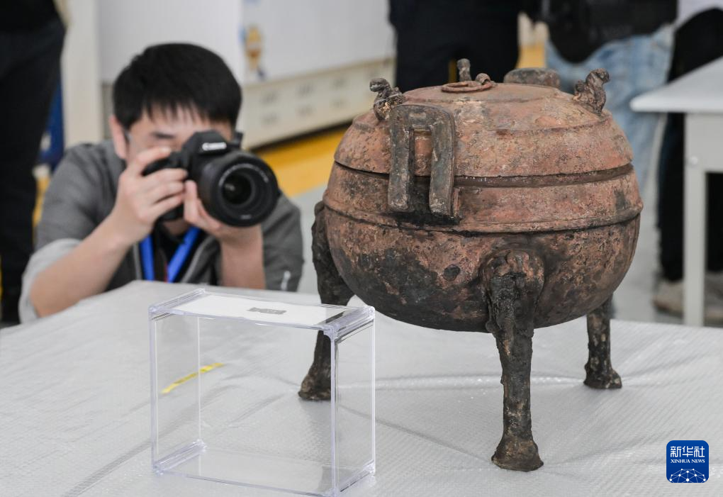 4月16日,媒體記者在武王墩墓考古實驗室內拍攝一件該墓出土的附耳子母口銅鼎。