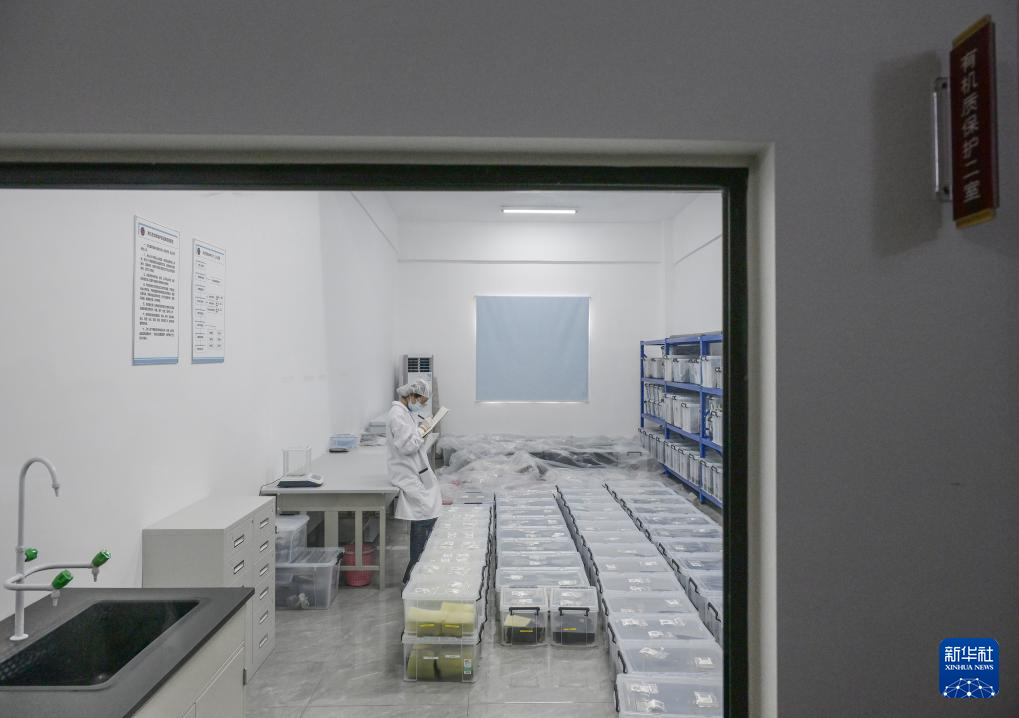 4月16日,考古工作者在武王墩考古實驗室有機質保護室內對出土木俑做保護工作。