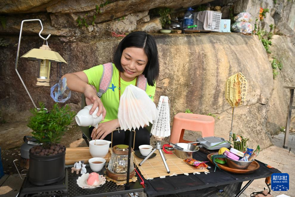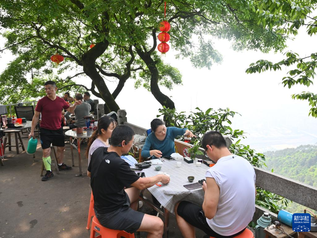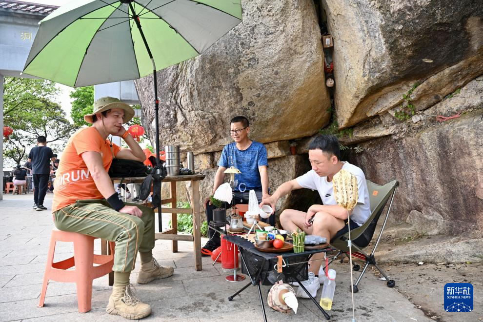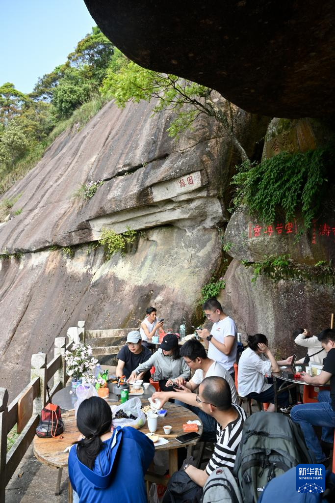 4月14日,在福州鼓山白云洞景點,登山愛好者在此停歇飲茶。