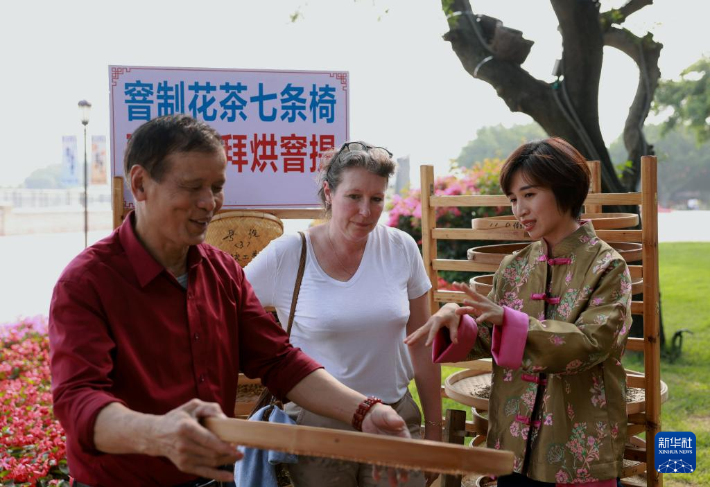 4月14日,在福州茉莉花文化體驗館,非遺技藝傳承大師為福州外國語學校與姊妹校巴黎斯坦尼斯學校的師生講解展示福州茉莉花茶窨制工藝。
