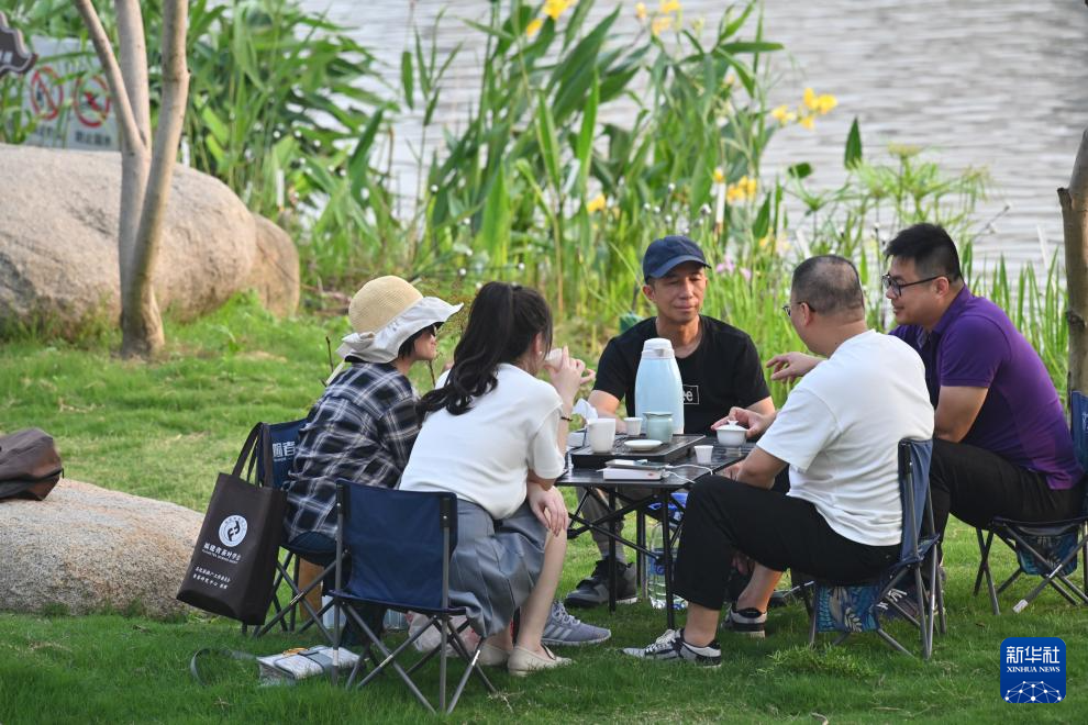 4月14日,在福州晉安湖公園,市民在湖畔泡茶聊天。