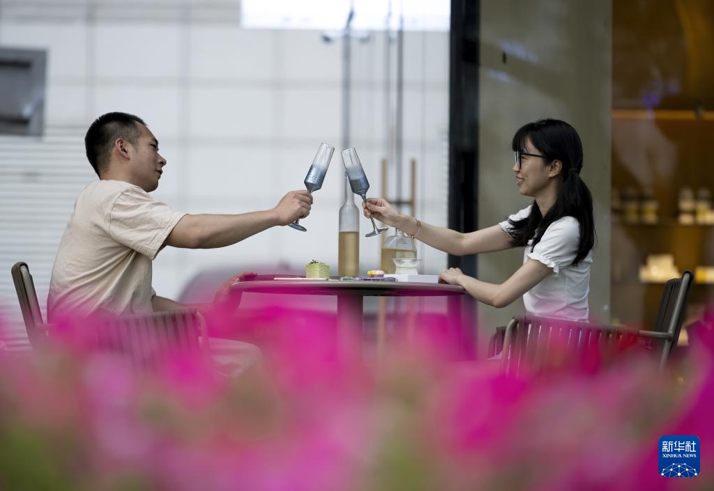 4月14日,消費者在福州東百大樓春倫ITEAMO茶空間品嘗各式茶飲。