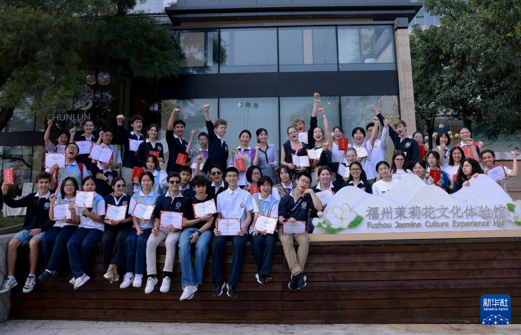 4月14日,在福州茉莉花文化體驗館,福州外國語學校與姊妹校巴黎斯坦尼斯學校的師生合影留念。