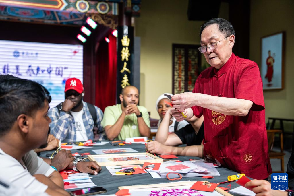 4月18日,在長沙非物質文化遺產館,留學生體驗剪紙。