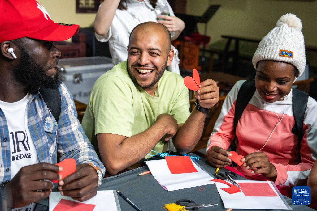 4月18日,在長沙非物質文化遺產館,體驗剪紙的留學生在相互交流。