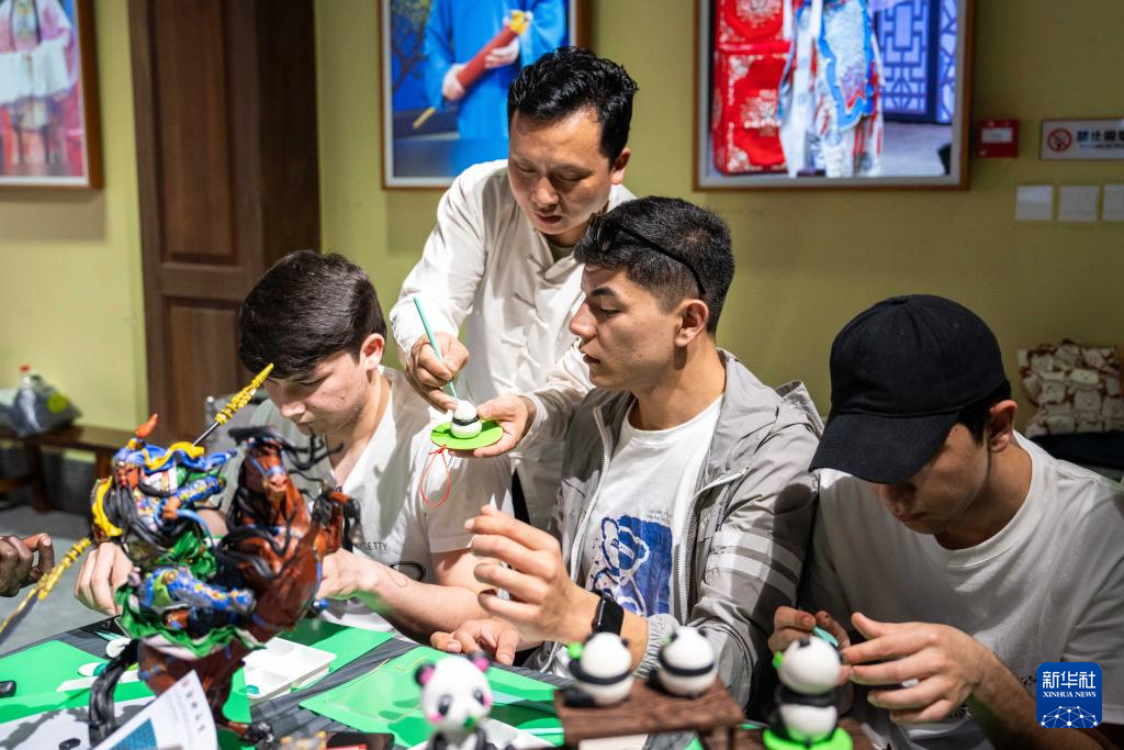 4月18日,在長沙非物質文化遺產館,非遺傳承人(左二)向留學生介紹面塑技藝。