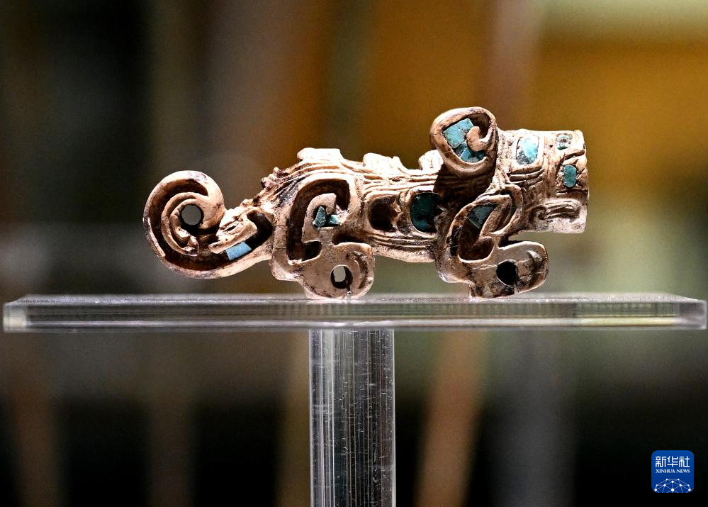 這是2024年2月23日拍攝的河南安陽殷墟博物館新館內展出的嵌綠松石骨虎。