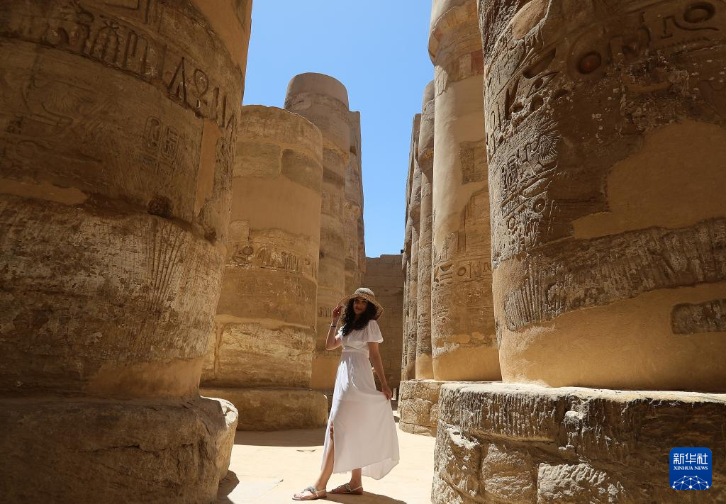 2024年4月8日,游客在埃及盧克索的卡爾納克神廟拍照。