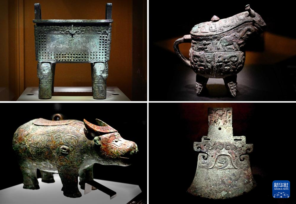 這是2024年2月23日拍攝的河南安陽殷墟博物館新館內展出的“司母辛”銅鼎(左上)、“亞長”銅?。ㄓ疑希?、“亞長”牛尊(左下)、“亞長”銅鉞(拼版照片)。
