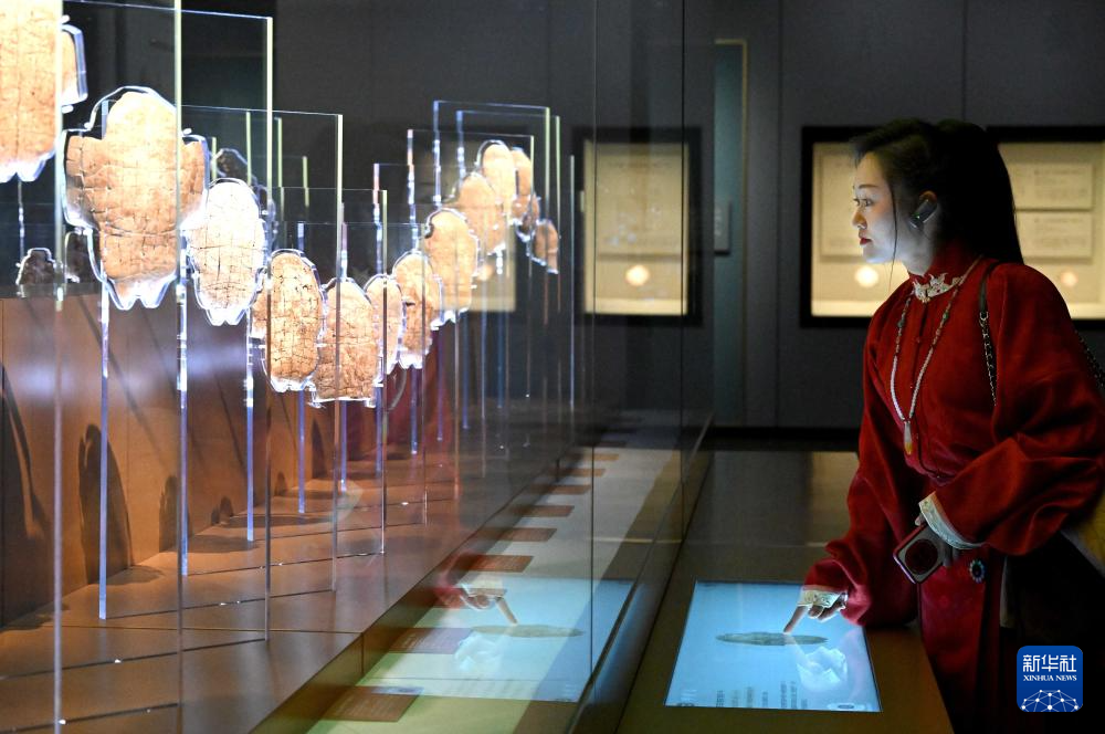 2024年2月26日,參觀者在河南安陽殷墟博物館新館內觀看展出的刻辭卜甲。